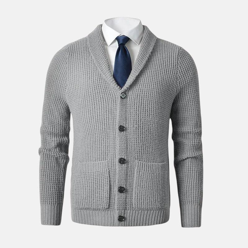 Este cardigan de punto para hombre eleva la comodidad a la vez que la presencia profesional. Con cierre frontal de botones, cuello chal y textura de punto grueso, acompaña con distinción a camisas y corbatas para la oficina y ocasiones de negocio.