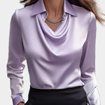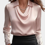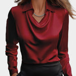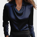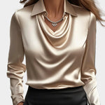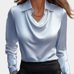 Dodajte ovu bijelu satensku bluzu s drapiranim dekolteom svojem ormaru i stvorite bezbroj stilskih kombinacija — od poslovnih sastanaka do večernjih izlazaka.
