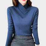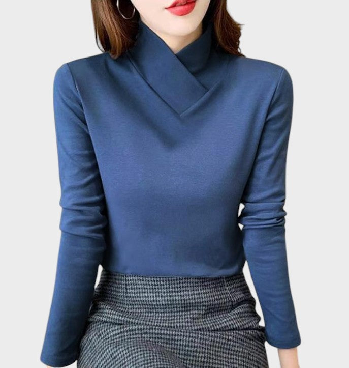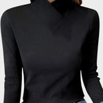 Ova profinjena bluza ističe se čistim linijama i preklopnim, visokim ovratnikom koji formira diskretan V-efekt. Glatka, rastezljiva tkanina lijepo prianja bez stezanja, a dugi rukavi i uredan rub daju minimalistički, moderan izgled. Kroj koji prati tijelo, ali nije pripijen, lako se kombinira s hlačama, suknjama i blejzerima—idealno za posao, putovanja i večernje izlaske.
