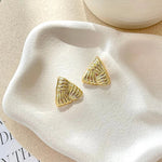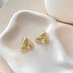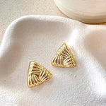 Madalena Earrings - Gold su trokutaste naušnice s prefinjenim zlatnim premazom i teksturiranim detaljima koji dodaju moderan, ali suptilan štih svakom outfitu. Zlatna završna obrada pojačava njihovu eleganciju, dok pouzdani stud back zatvarač osigurava siguran i udoban osjećaj tijekom cijelog dana ili večernjih događaja.
