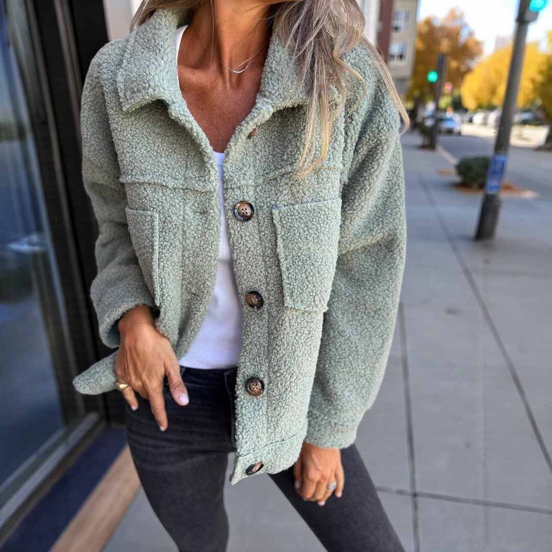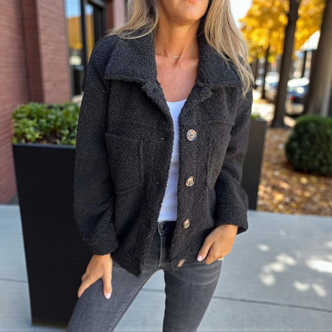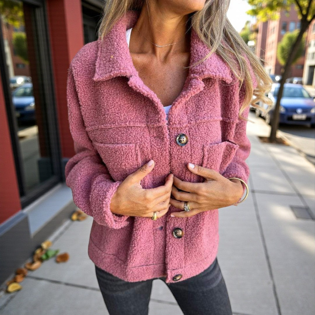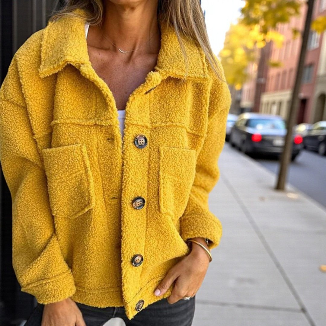 Ovaj ženski kaput od mekog, plišanog materijala donosi moderan i topao izgled, idealan za hladnije dane. Kratki kroj s ovratnikom i prednjim gumbima daje mu ležeran, ali elegantan dojam. Šavovi i strukturirani kroj stvaraju profinjenu siluetu koja se lako uklapa u različite kombinacije.
