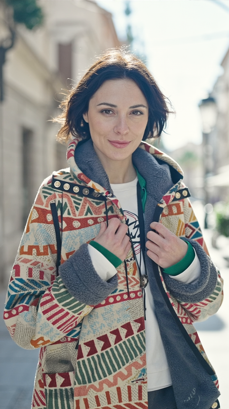 - Odvažan, umjetnički dizajn: Mirrin nije običan kardigan – to je stilizirani statement komad s modernim umjetničkim uzorcima koji vas čini upečatljivima uz potpunu toplinu i udobnost.