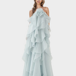 Ova maksi haljina s romantičnim i aristokratskim stilom donosi sofisticiranost i poseban sjaj za večernje prigode. U toploj kestenjasto crvenoj nijansi (Terracotta) ističe ženstvenost i diskretnu eleganciju. Višeslojni volani od lagane, prozračne tkanine stvaraju impresivan pokret i dojam plutanja na svakom koraku.