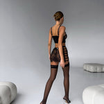 Uključuje: bustier oblikovan za potporu i konture dekolta, suknja s hrabrim izrezima duž bočnih strana koja naglašava siluetu, te usklađene gaćice-tanga – sve zajedno za savršeni završni dodir.