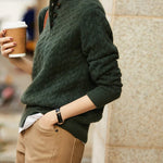 - Pletena tekstura: klasična kabelska pletenina koja dodaje dubinu i stil