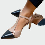 Bež dvobojne salonke s crnim vrhom i remenom u obliku slova T savršen su spoj klasične elegancije i modernog stila. Kožna izrada visoke kvalitete osigurava dugotrajnost i udobnost, dok tanak T-remen pruža stabilnost i naglašava oblik stopala. Visoka potpetica dodaje ženstvenu visinu i sofisticiranost, idealne su za večernje izlaske, poslovne sastanke ili formalne prigODE.
