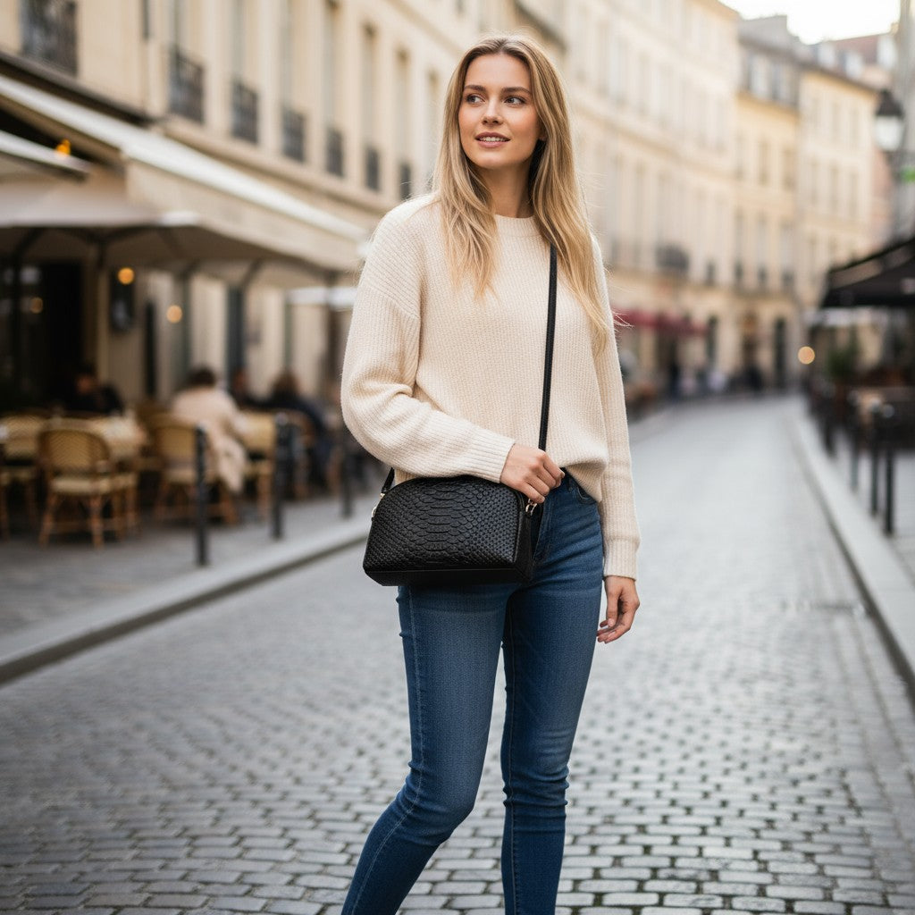 S teksturom inspiriranom zmijskom kožom i elegantnom crnom završnom obradom, ovaj model podiže svaku kombinaciju uz snažan i profinjen dojam. Kompaktan, strukturiran i funkcionalan dizajn čini je savršenim izborom za nošenje najvažnijih stvari sa stilom — u svakodnevnim situacijama, na događanjima ili večernjim izlascima.