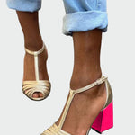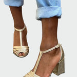 Elegantne sandale s T-trakom od zlatnog metalnog završetka donose spoj sofisticiranosti i stabilnosti. Dizajn s T-trakom i kriznim trakama oko stopala obavija nogu za sigurnu i elegantnu šetnju, dok čvrsta potpetica osigurava udoban i siguran hod.