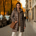 Ovaj ženski postavljeni kaput donosi moderan i profinjen izgled zahvaljujući srednjoj dužini i praktičnoj kapuljači, idealnoj za hladnije dane. Mat završetak i šavovi stvaraju urednu i elegantnu siluetu, a pritom zadržavaju udobnost.