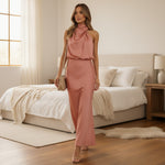 Ova duga ženska haljina ima moderan i elegantan dizajn s visokim drapiranim ovratnikom i lepršavim krojem koji naglašava siluetu. Mekana tkanina i lagan pad daju ženstven i sofisticiran izgled, idealan za svečane prigode i posebne trenutke.