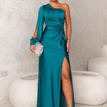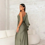 Ovaj dugi model u maslinastozelenoj boji utjelovljuje profinjenost — s jednim ramenom otkrivenim i drapiranim detaljem koji savršeno naglašava struk. Visoki prorez dodaje dozu odvažnosti, uz savršenu ravnotežu elegancije i senzualnosti.