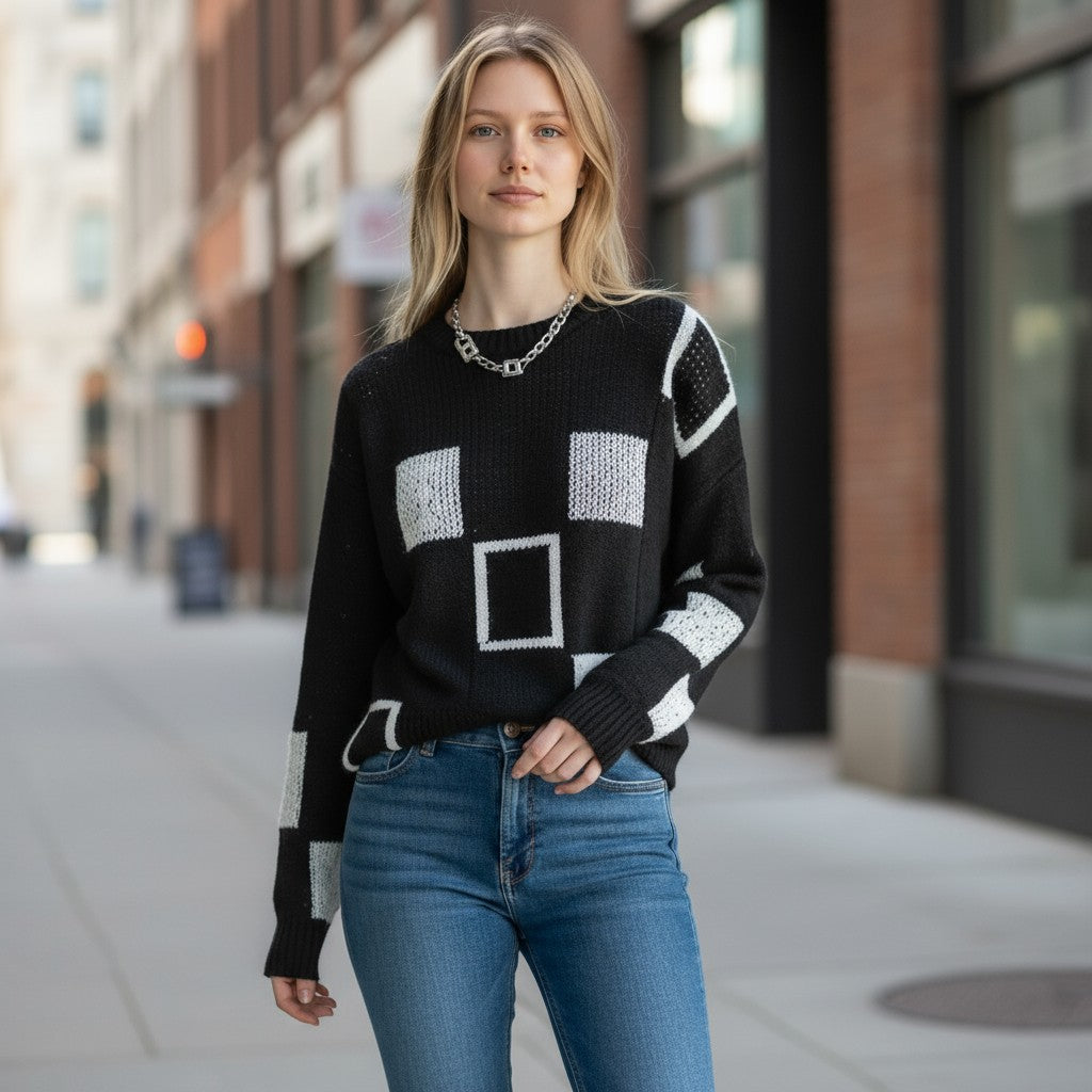 Sa sofisticiranim geometrijskim uzorkom, ovaj model nudi savršen sklad između stila i praktičnosti. Širi kroj omogućuje slobodu pokreta, dok mekano pletivo pruža toplinu i ugodan dodir na koži. Idealan za svakodnevne ili poslovne kombinacije s modernim i profinjenim dojmom.