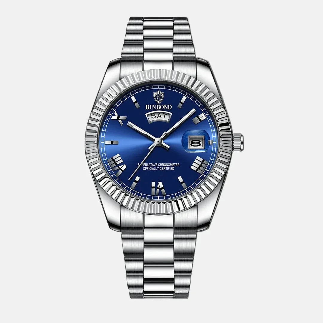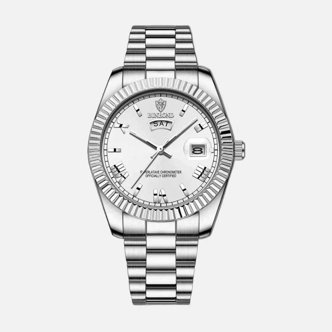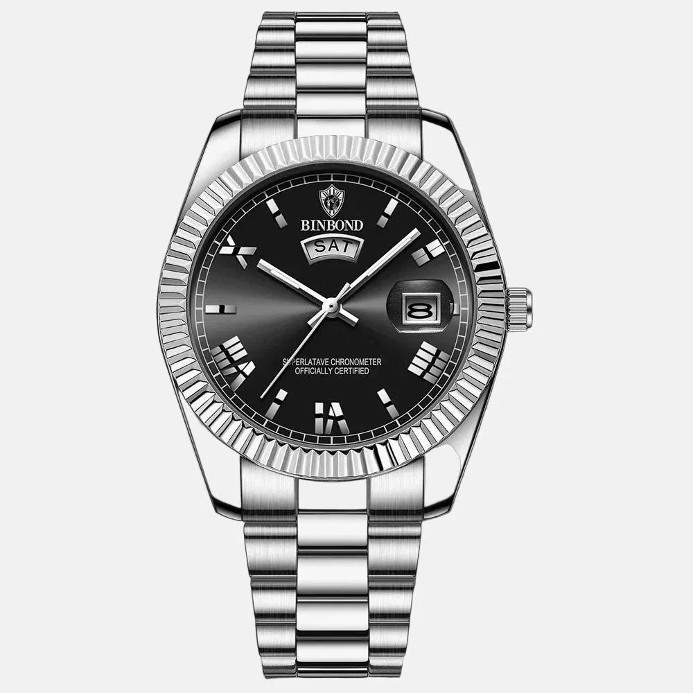 Presentamos el reloj BinBond, una fusión excepcional de ingeniería de precisión y estilo atemporal. Diseñado para aquellos que exigen fiabilidad, este exclusivo reloj destaca por su movimiento de cuarzo italiano y su meticulosa fabricación.